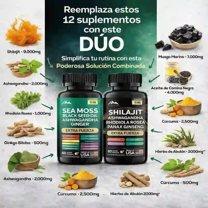 Hemos unido 22 de los superalimentos más potentes del planeta en 2 fórmulas que trabajan juntas. El secreto es la sinergia: la pimienta negra potencia la cúrcuma y el shilajit maximiza la absorción del Sea Moss.